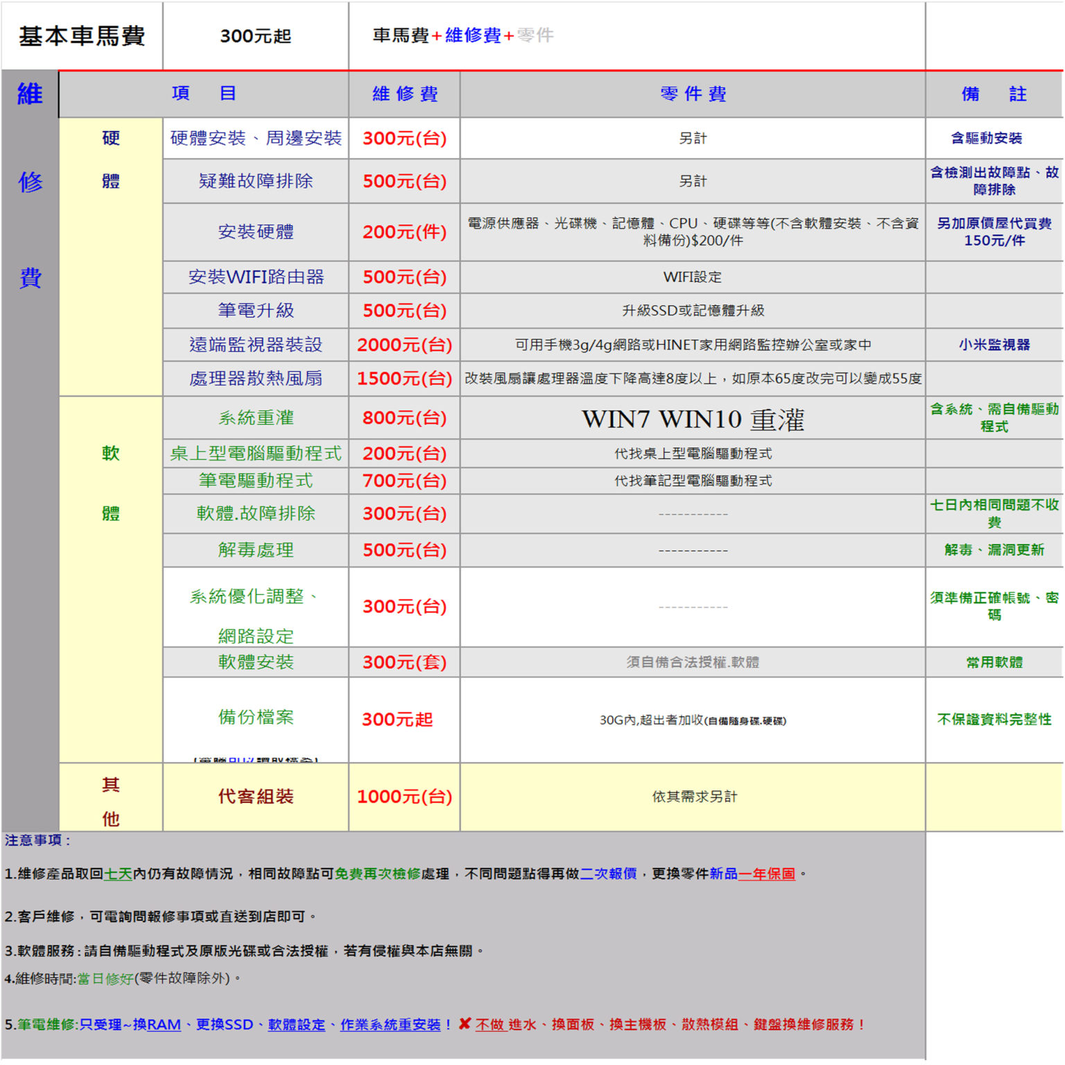 ps.筆電NB除了重灌能現場處理外,其他如主機板、螢幕故障等,無法現場處理,需取回維修。